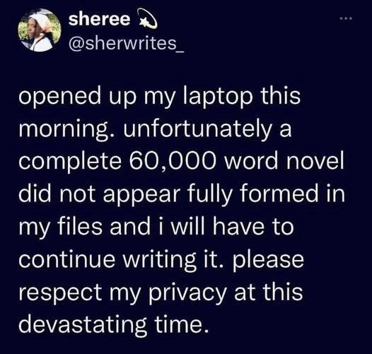 Now, I’m sure that this author does genuinely enjoy her work. This is just a good-natured grouse. “Ugh, I actually have to work on my draft!” This is a pretty common joke to make and I don’t think that the original poster meant it in the way that I’m about to interpret it.